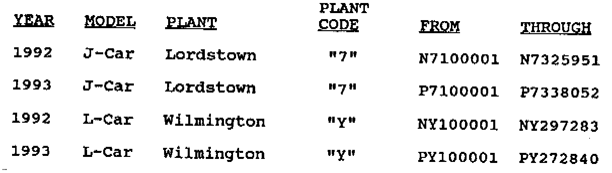 Involved are certain 1992-93 Chevrolet Cavalier, Corsica and Beretta model vehicles equipped with 2.2L Engines (RPO LN2) and built within the VIN breakpoints shown in the figure.