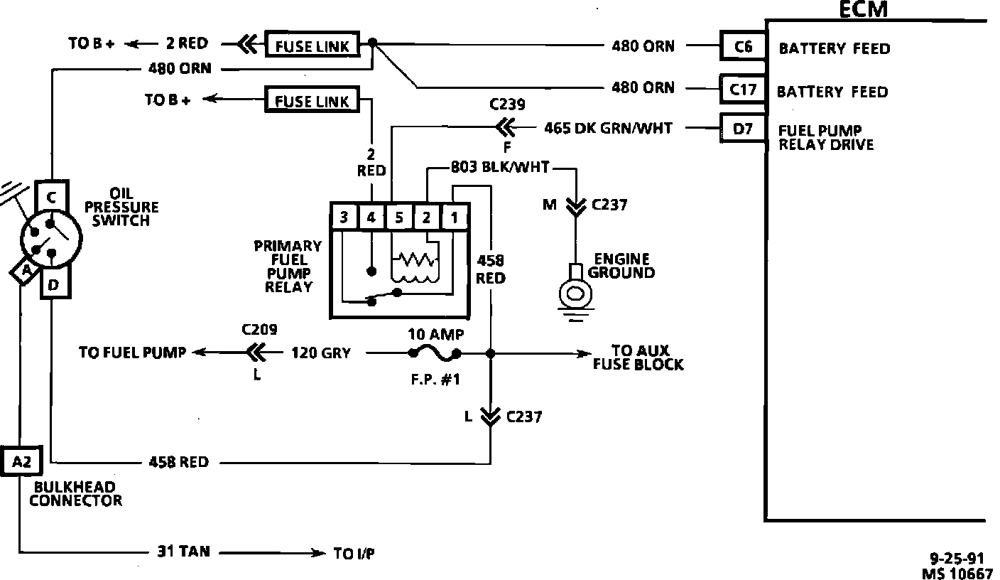 After the engine starts (ignition pulses being received and engine speed greater than 500 rpm), the ECM turns the fuel pump relay "OFF", and power is supplied to the fuel pump through a switch in the oil pressure sensor. The fuel pump switch in the oil pressure sensor is normally "OPEN" and closes when there is sufficient oil pressure. If the oil pressure should fall below the critical level while the engine is running, the switch opens and the fuel pump turns "OFF" and the engine will die. This is to stop the engine from running without oil pressure and help prevent engine damage.