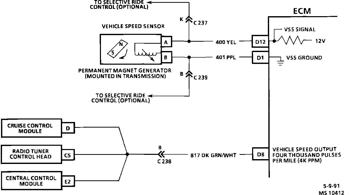 The VSS system uses a permanent magnet generator. The VSS produces an AC voltage signal that increases with vehicle speed.
