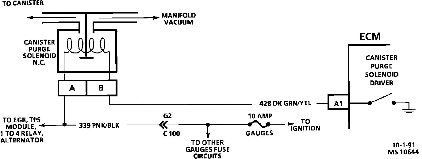 3. Checks for a complete circuit. Normally, there is ignition voltage on CKT 339 and the ECM provides a ground on CKT 428. A shorted solenoid could cause an open circuit in the ECM.