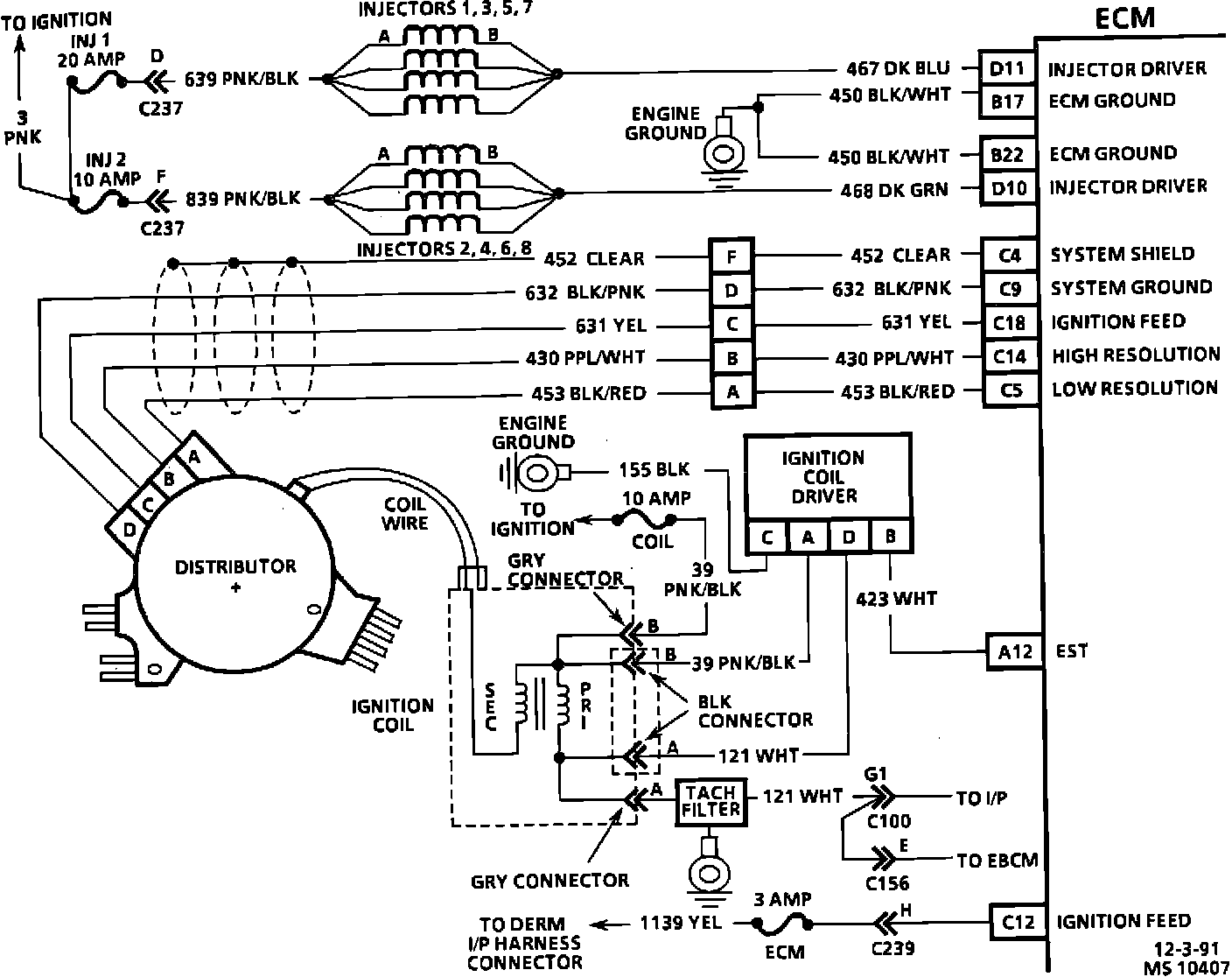 The ignition system consists of a distributor, control circuits for ignition timing in the ECM, a separate ignition coil/Ignition Control Module (ICM) assembly, primary and secondary wiring and eight spark plugs.