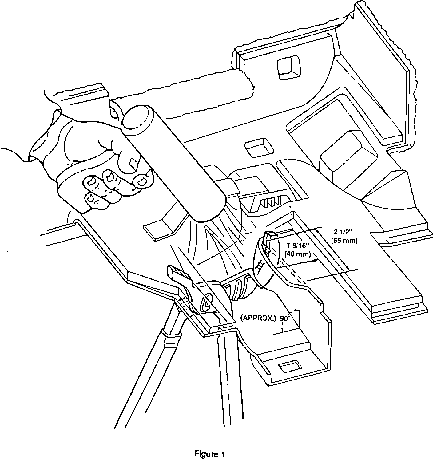 4. Using Channel Locks size 16 or larger, place near upper left-hand corner of I/P left-hand lower trim panel as shown in Figure 1. Quickly reform brake pedal opening to configuration and dimensions indicated in Figure 1. If necessary, Channel Locks may be moved downward during initial reforming and/or steps 3 and 4 may be repeated to obtain minimum clearance of 2 mm between brake service pedal arm and I/P lefthand lower trim panel.