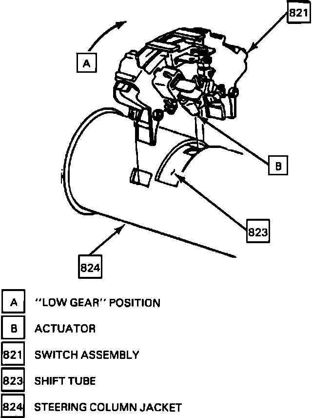 e. Old Switch only- Move switch assembly (821) to "LOW" gear position. Place transmission in PARK; switch assembly (821) will ratchet as it adjust itself.