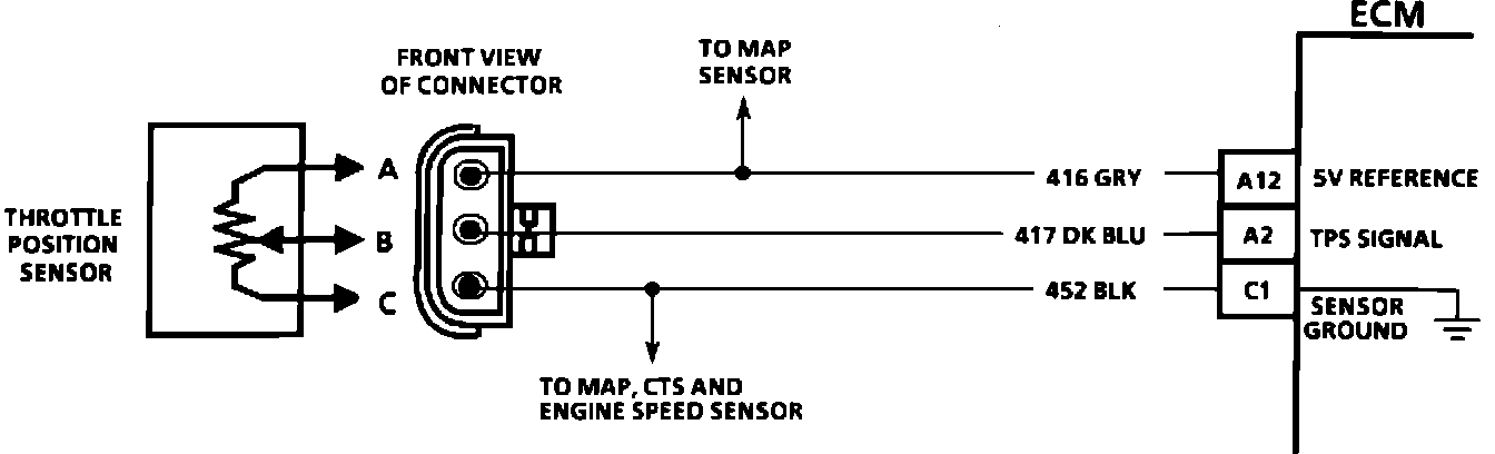 The TPS is a potentiometer with one end connected to 5 volts from the PCM/TCM and the other to ground. A third wire is connected to the PCM/TCM to measure the voltage from the TPS.