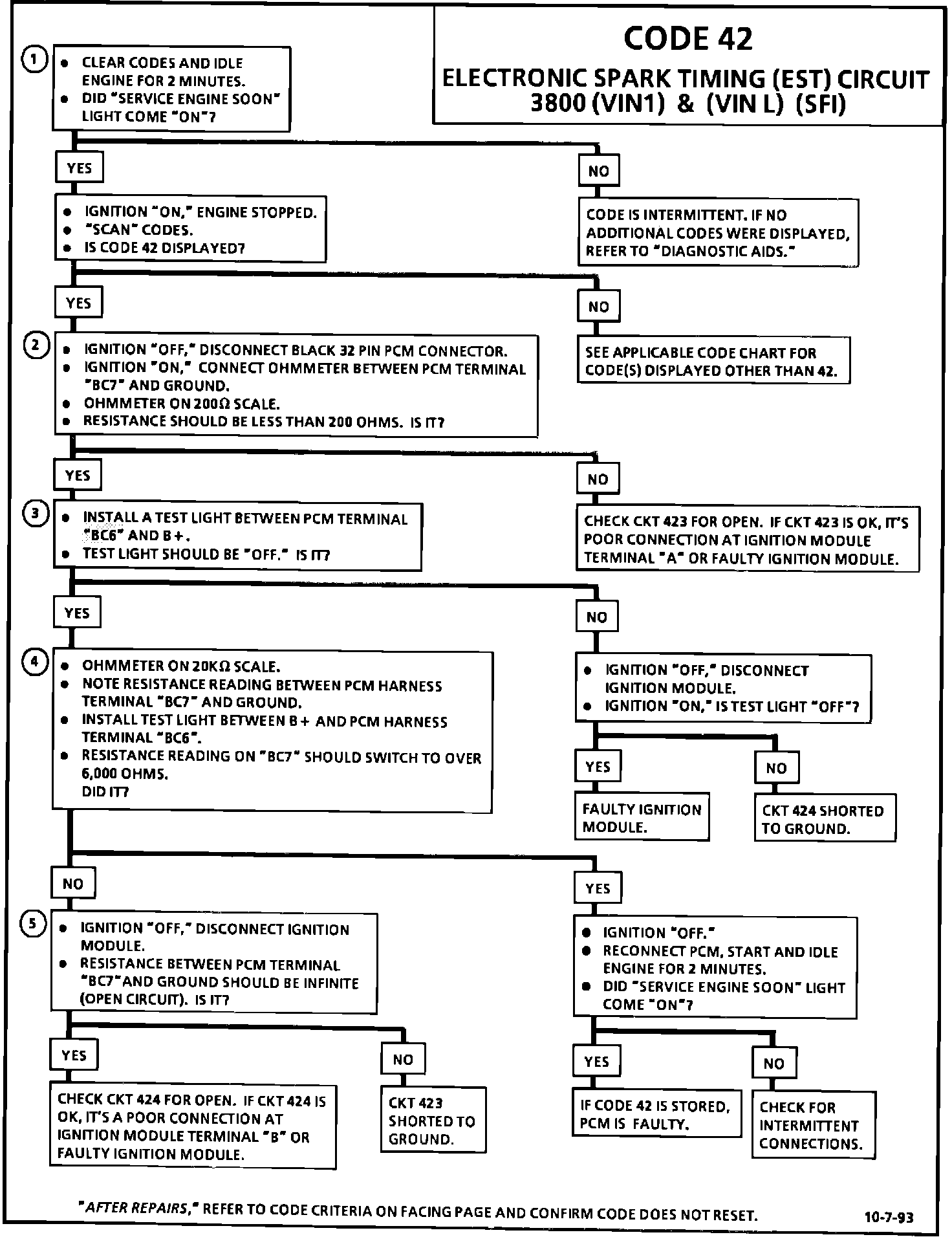 This bulletin updates the code 42 Diagnostic Chart in Service Manual Section 6E3, "Driveability and Emissions". The revised diagnostic chart includes the correct terminal location for bypass CKT 424 at the PCM.