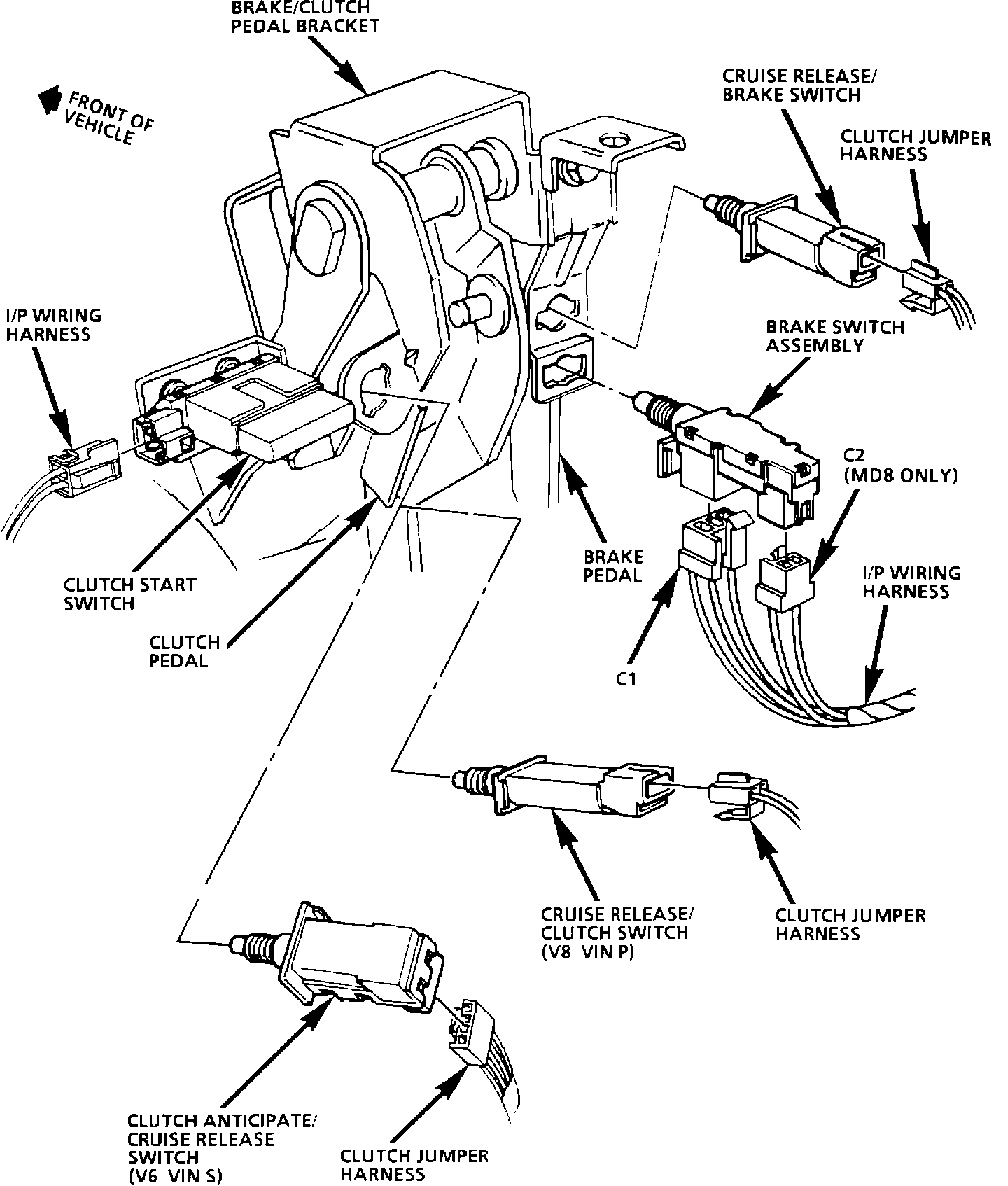 The brake switch is mounted on the brake pedal assembly near the brake pedal.