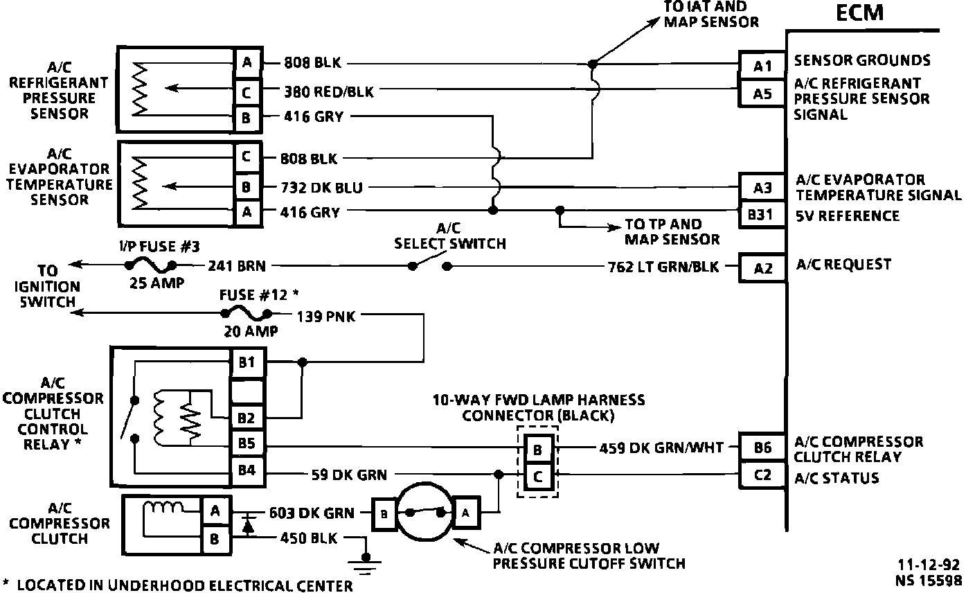 When the ECM detects that A/C has been requested, the ECM supplies a ground signal to the coil inside the A/C relay. The switch portion of the relay is now operated, energizing the A/C compressor clutch.