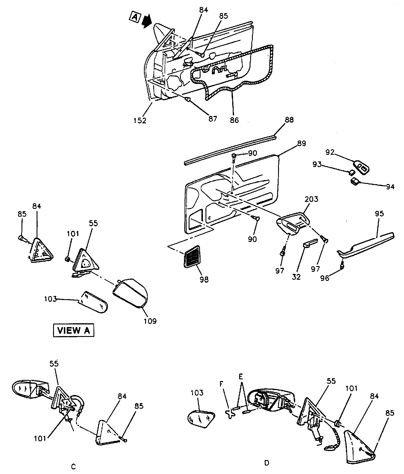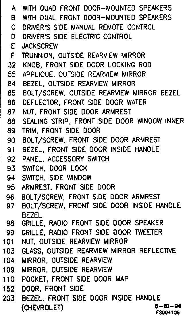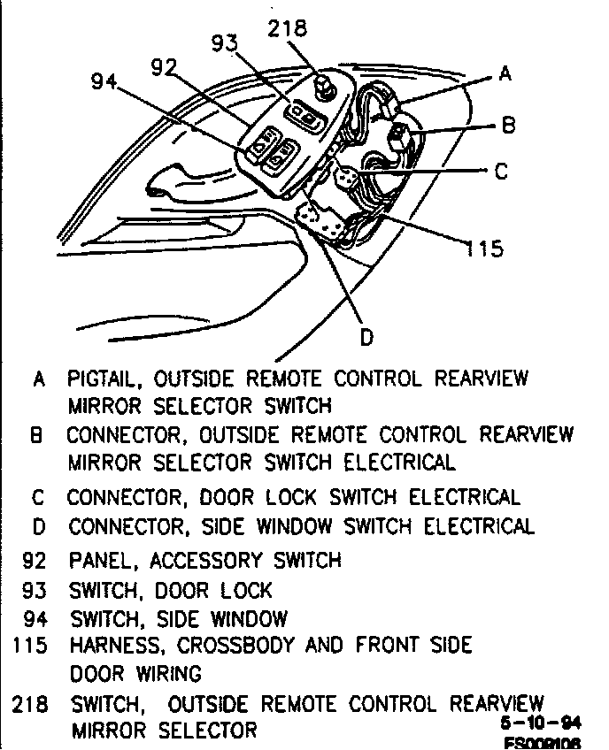 Note:If the vehicle is equipped with side window, mirror selector or door lock switches (92, 93, and 94, or 218), it will have a panel assembly (92). If the vehicle is not equipped with any of these switches, then it will have a cover assembly. Both parts are removed in the same way.NOTICE: When removing the panel assembly, the ignition switch must be in the "OFF" position and retained accessory power (RAP) must not be present. This will eliminate the possibility of shorting out the switch if a screwdriver, awl or metal object is used.