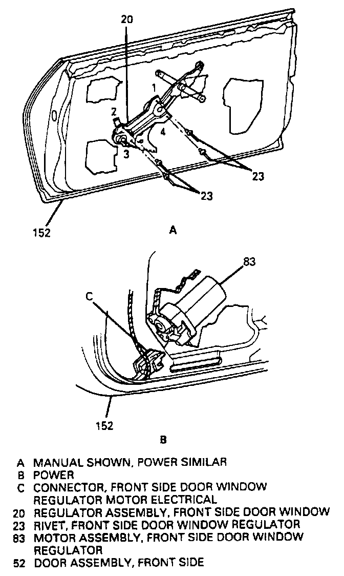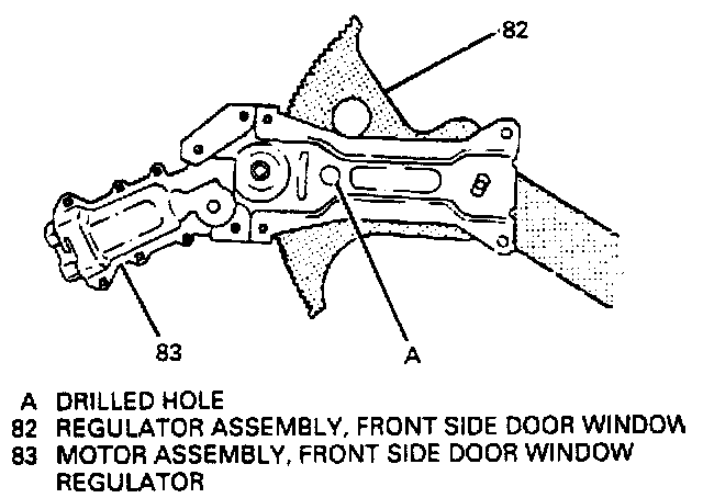 1. Regulator assembly (20 or 82), with motor assembly (83) attached if equipped, through rear access hole.