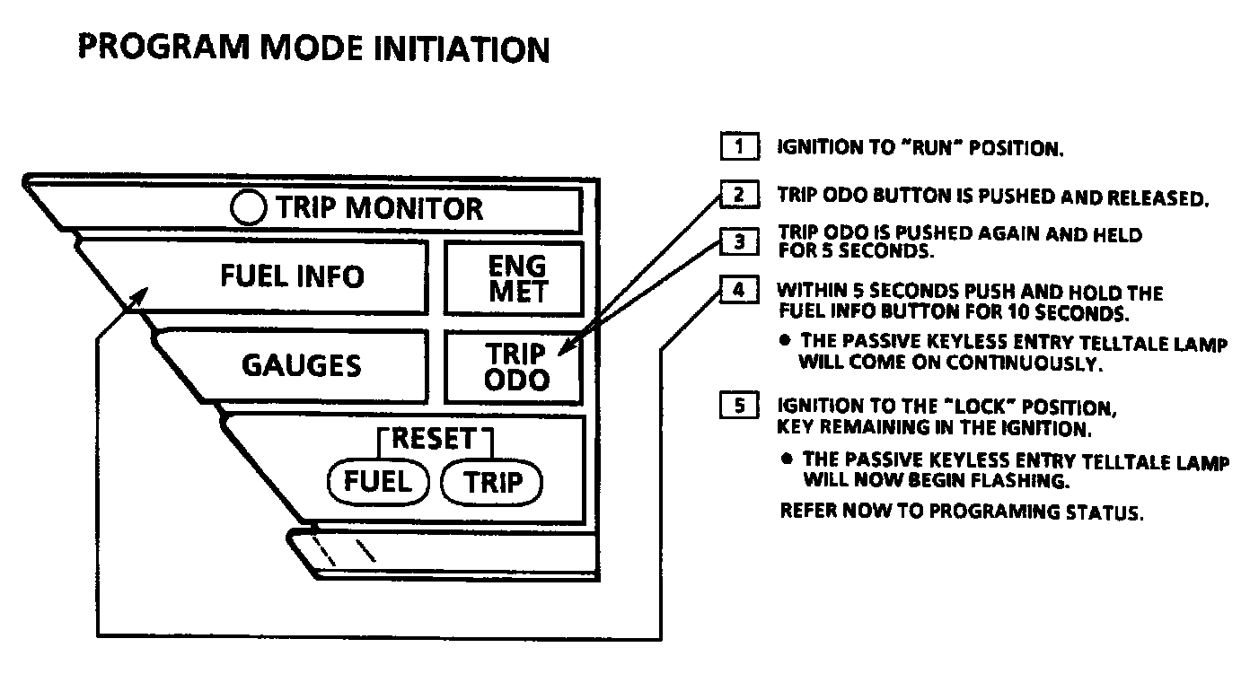 Programming is initiated by entering a specified button sequence on the Driver Information Center (DIC). The DIC interfaces with the CCM. Refer to the illustration for the program mode initiation procedure.