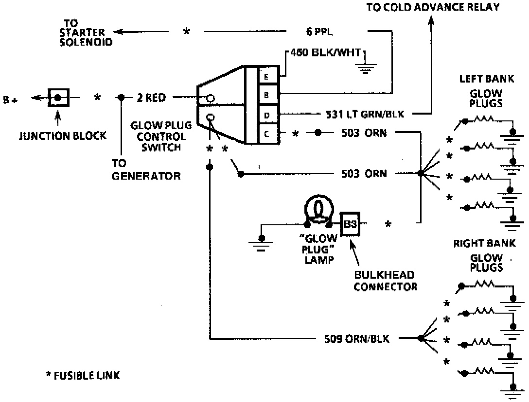 With the ignition switch "ON," and engine coolant temperature below approximately 65°C (150°F), the ECM/PCM turns "ON" the cold advance relay to supply 12 volts to the glow plug control switch and the cold advance solenoid. The control switch, in turn, will cycle the glow plugs "ON" and "OFF" for a pre-determined amount of time. After the engine is cranked, the glow plugs will again cycle "ON" and "OFF," for a short period of time.