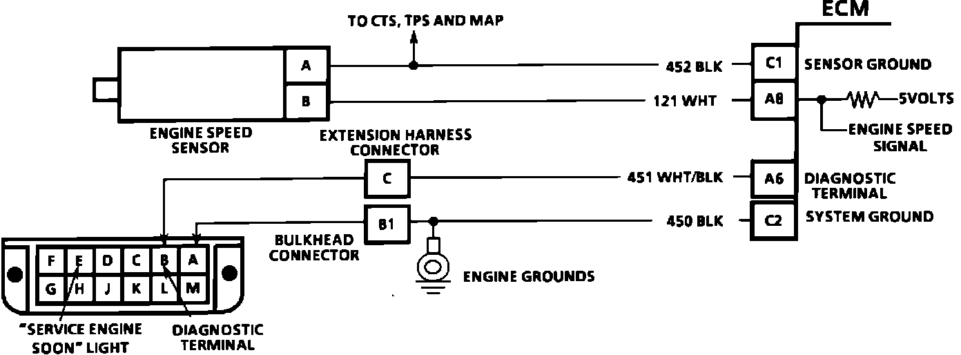 The Engine Speed Sensor is supplied with a 5 volt reference by the ECM/TCM. The sensor relays 4 pulses back to the ECM/TCM per engine revolution. As the number of revolutions increase, so does the number of pulses. By interpreting the number of pulses the ECM/TCM can monitor the engine speed.
