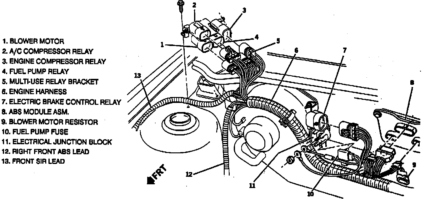 The A/C Compressor Control Relay is located on the RH front strut tower, on bracket.