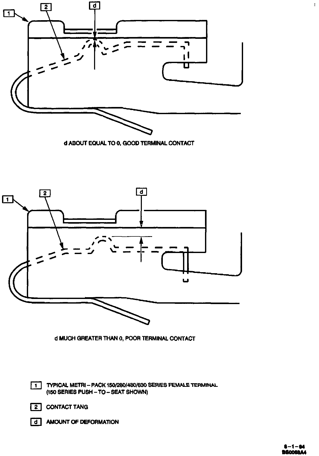 Deformation is caused by probing the mating side of a connector terminal without the proper adapter, improperly joining the connector halves or repeatedly separating and joining the connector halves. Deformation, usually to the female terminal contact tang, can result in poor terminal contact, causing an open or intermittently open circuit.