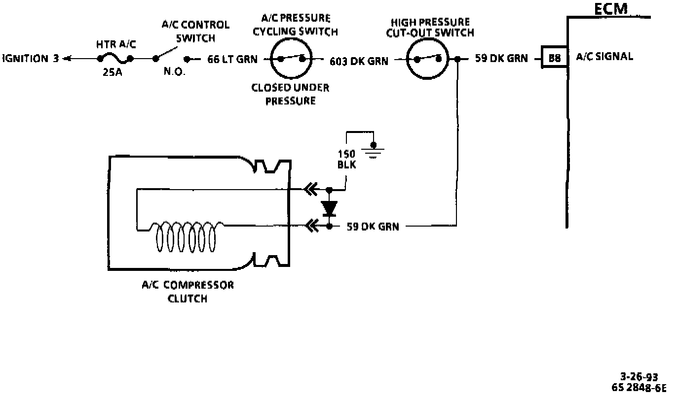 Turning "ON" the air conditioning supplies CKT 59 battery voltage to the A/C compressor clutch and to terminal "B8" of the ECM connector to increase and maintain idle speed.