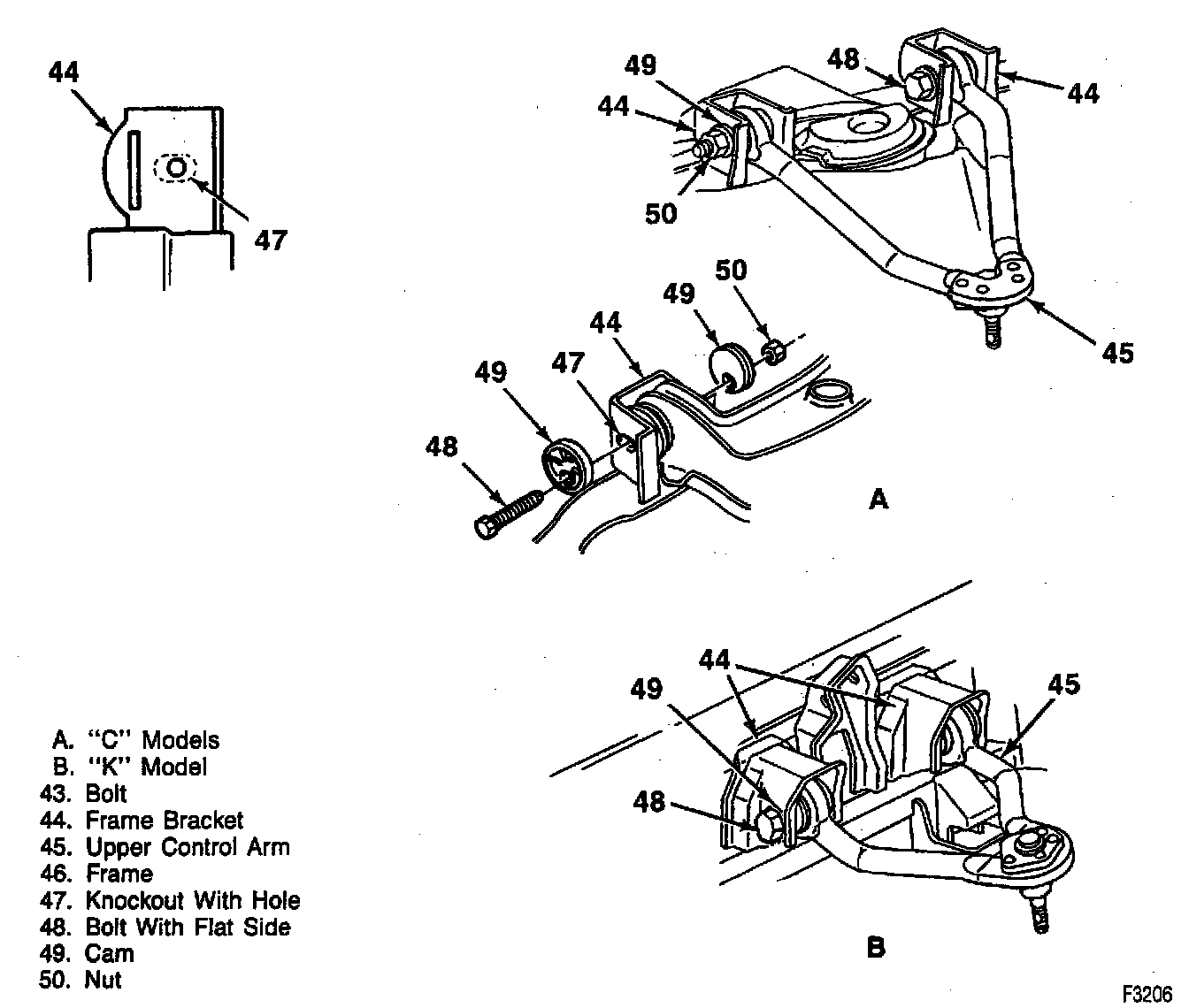 2. Bolts (48) and cams (49) through frame brackets (44), and control arm (45).