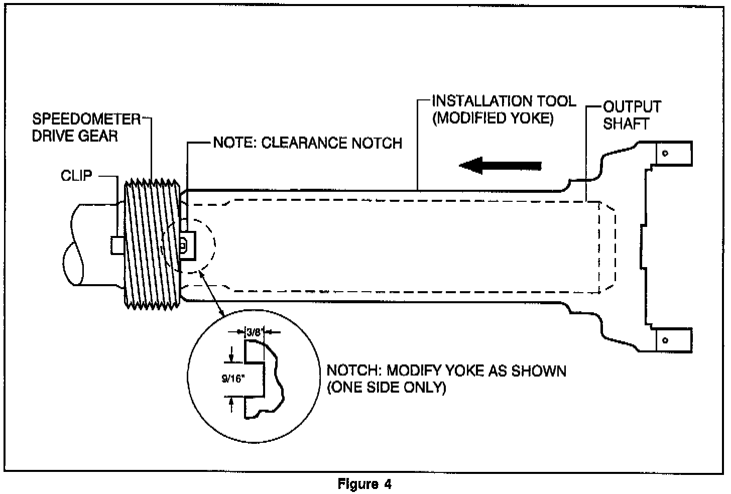 To Insure the squareness of installation, the yoke must NOT contact the retaining clip (28) while the speedometer drive gear (27) is being installed. The modified notch in the yoke provides the necessary clearance.