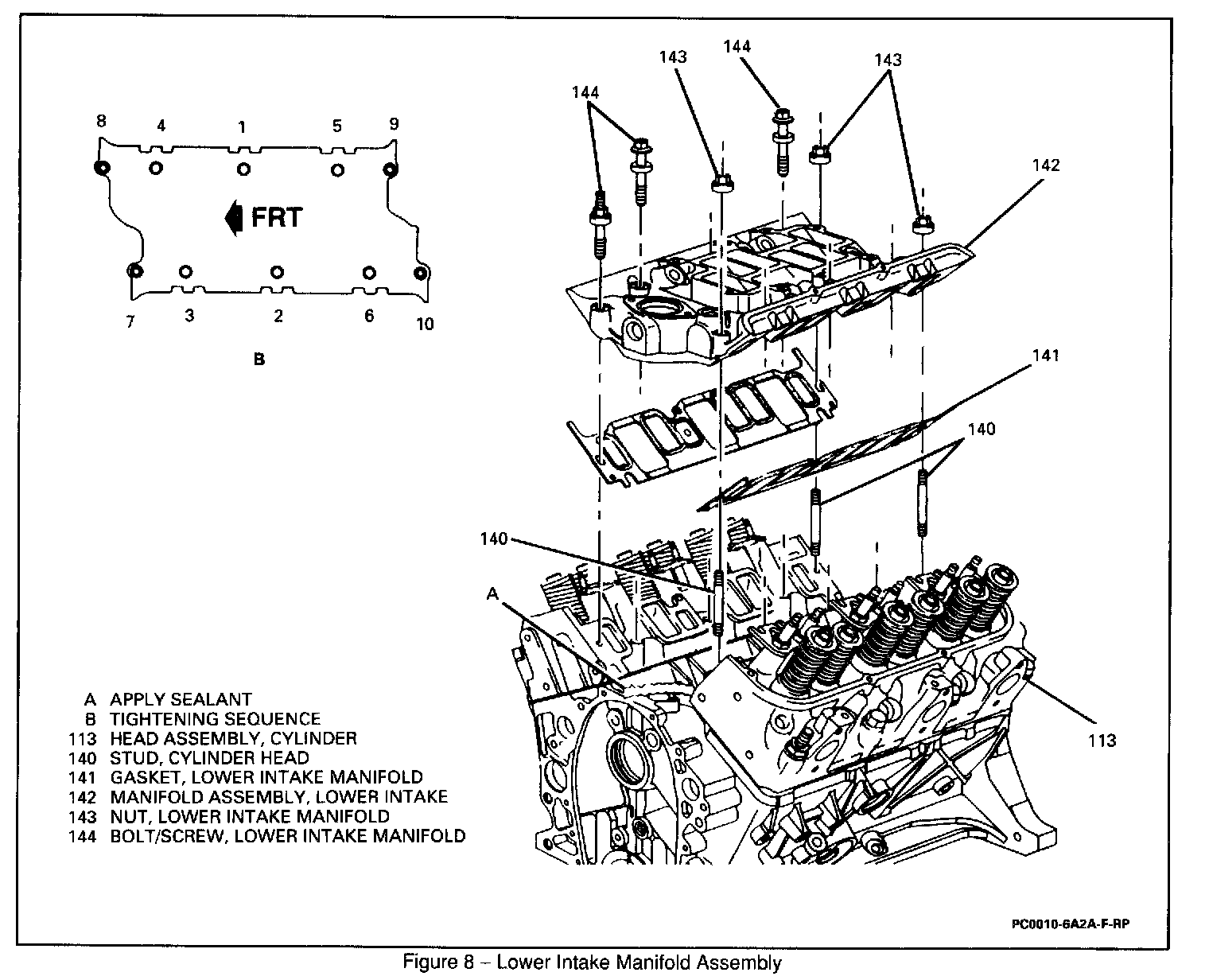 3. Apply sealant GM p/n 12345739 at both ends where the intake manifold mates the engine block.