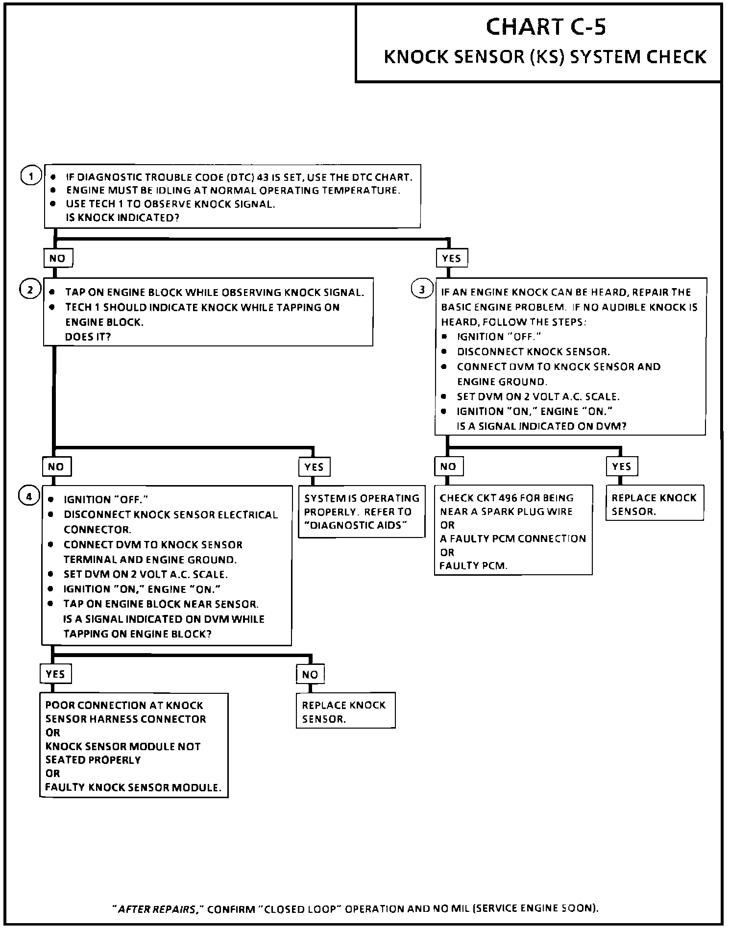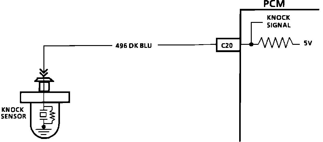 The Knock Sensor (KS) is used to detect engine detonation and the PCM will retard the ignition control timing based on the signal being received. The circuitry within the knock sensor causes the PCM's 5 volts to be pulled down so that under a no knock condition CKT 496 would measure about 2.5 volts. The knock sensor produces an AC signal which rides on the 2.5 volts DC voltage. The amplitude and frequency are dependent upon the knock level.