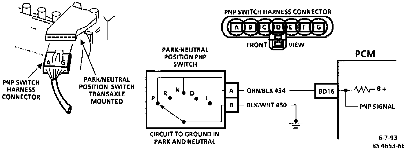 The Park/Neutral Position (PNP) switch contacts shown are a part of the Park/Neutral position switch and are closed to ground in park or neutral, and open in drive ranges.