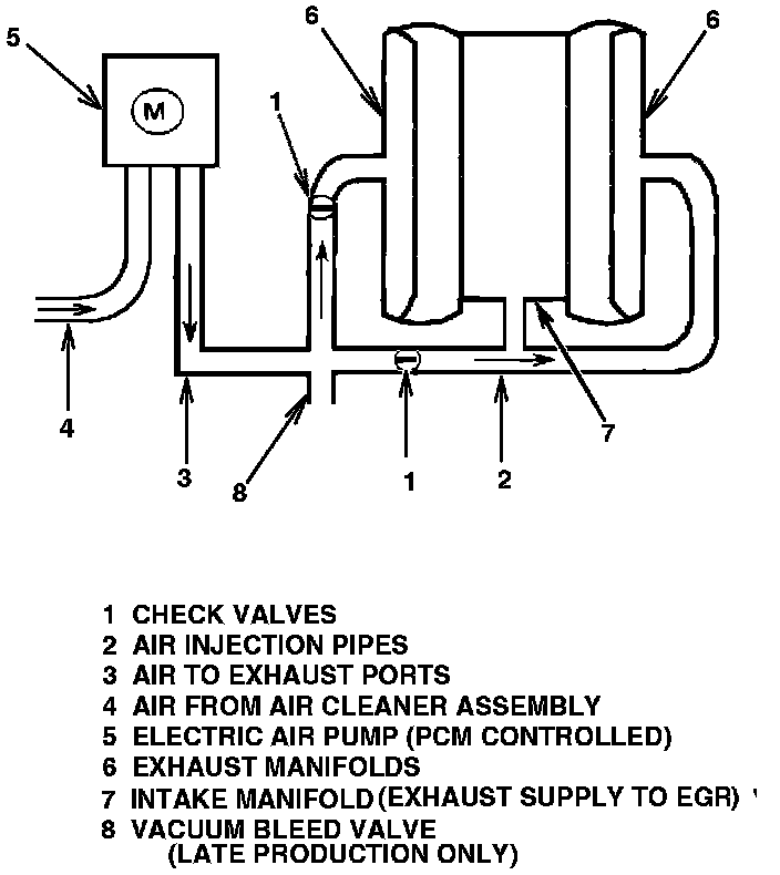 The electric air pump draws fresh filtered air from the air cleaner assembly and pumps it to the exhaust system through the air pipe and check valve assembly. The pump is PCM controlled through use of the air pump relay. During cold starts when the temperature is greater than 15°C (595°F), the PCM energizes the relay, turning the air pump and integral stop valve "ON". When the pump is operating, the integral stop valve is open to the exhaust system, and air is pumped into the exhaust manifolds to help oxidize excess hydrocarbons exiting the engine