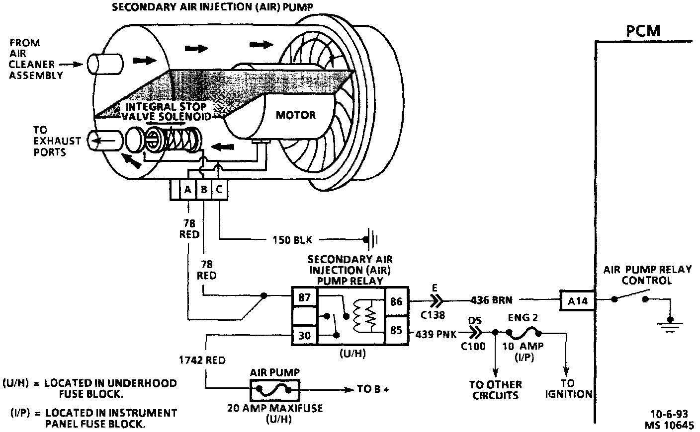The air pump relay gets ignition voltage when the key is turned "ON" and becomes energized when the PCM completes the driver circuit to ground. When the relay is energized, a switch in the relay connects battery power to the air pump and stop valve solenoid in the pump, turning the pump and stop valve "ON". When the fuel system goes into "CLOSED LOOP" operation, or when the air pump has been running for a maximum of 240 seconds, the relay is de-energized and the AIR system is turned "OFF". When the pump is "OFF", the stop valve is also turned "OFF" and residual air pressure is diverted to the atmosphere while the pump spins down.