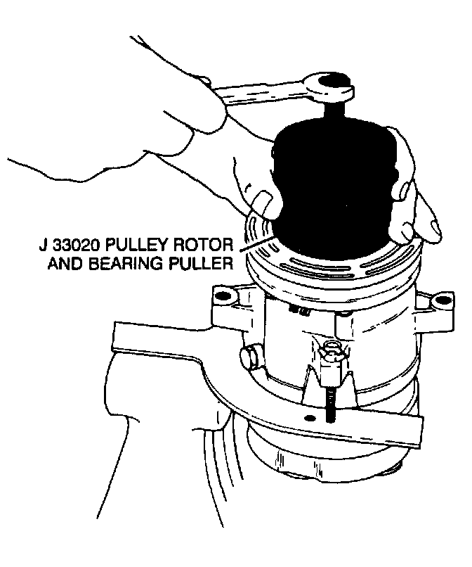 4. Hold the J 33020 puller in place and tighten the puller screw against the puller guide to remove the pulley rotor and bearing assembly.