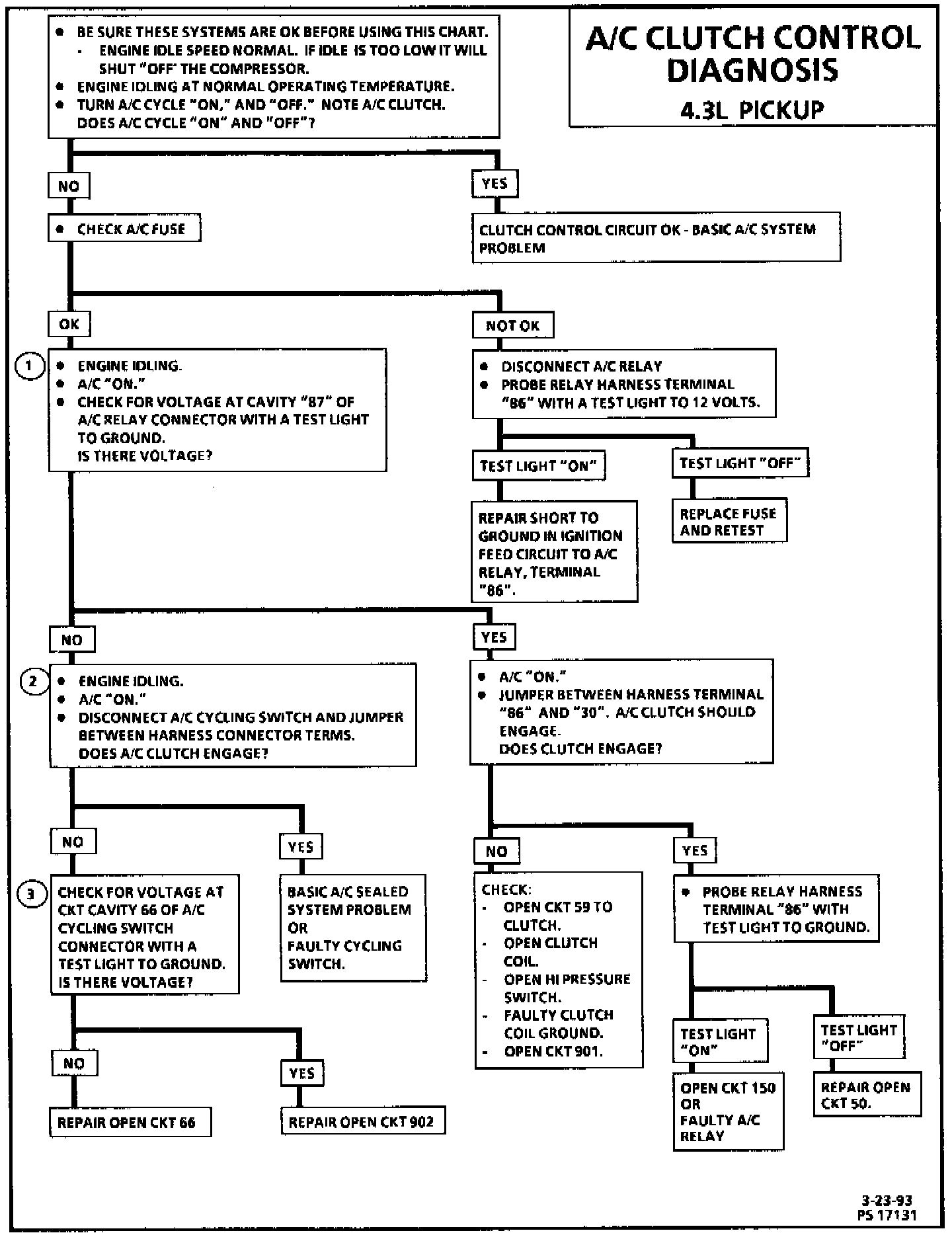 If A/C is operating properly and idle speed dips too low when the A/C compressor turns "ON" or flares too high when the A/C compressor turns "OFF," check for an open CKT 59 to the PCM. If circuits are OK, it is a faulty PCM connector terminal "E12" or PCM.