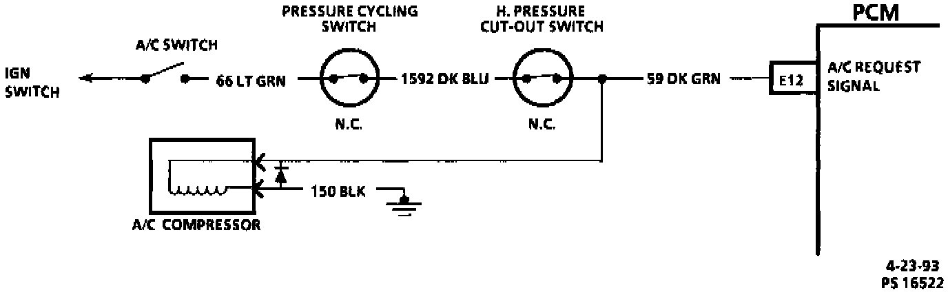 Turning "ON" the air conditioning supplies CKT 59 battery voltage to the A/C compressor clutch and to terminal "E12" of the PCM connector to increase and maintain idle speed.