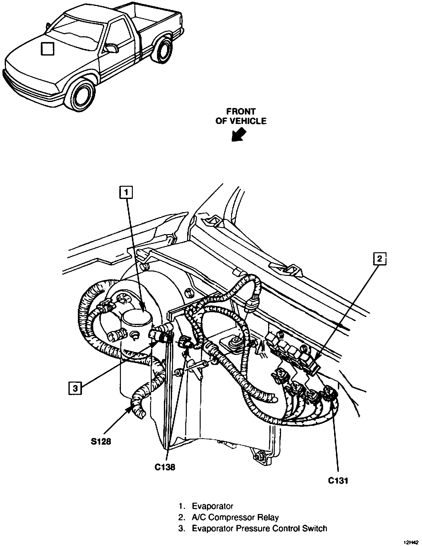 The A/C Compressor Control Relay is located in Engine Compartment, on LH side of cowl.