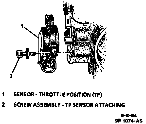 The Throttle Position (TP) sensor is a potentiometer connected to the throttle shaft on the throttle body. By monitoring the voltage on the signal line, the Powertrain Control Module (PCM) calculates throttle position. The PCM calculates fuel delivery based on throttle valve angle (driver demand).