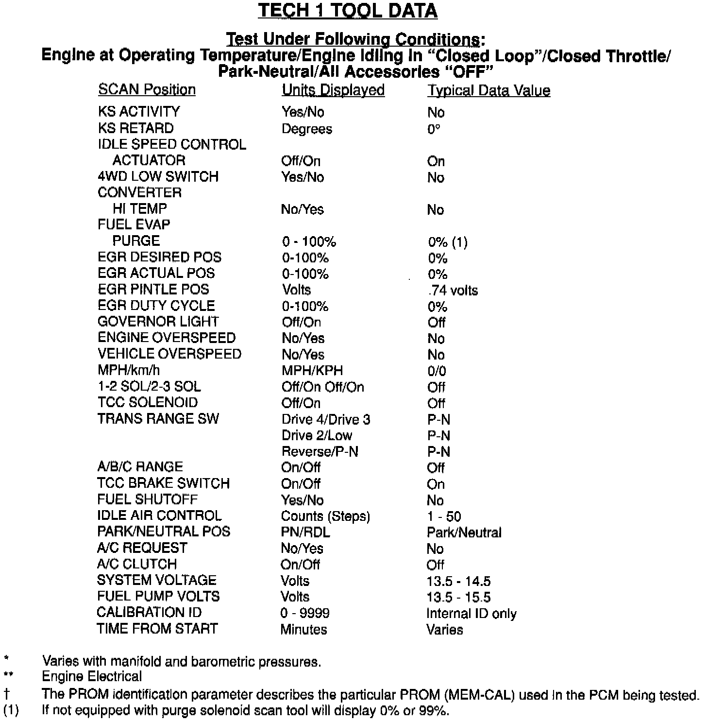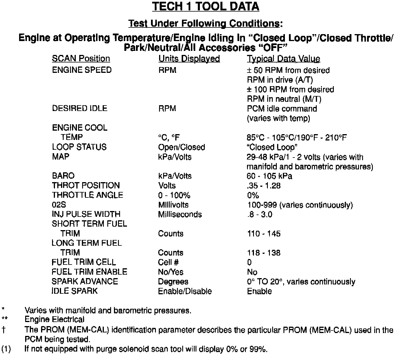 Only the parameters listed in the images are used for diagnosis. If a scan tool displays other parameters, the values are not recommended by General Motors for use in diagnosis. For more description on the values and use of the Tech 1 to diagnose Powertrain Control Module (PCM) inputs refer to Testing and Inspection of the component being tested.. If all values are within the range illustrated, refer to Diagnosis By Symptom.
