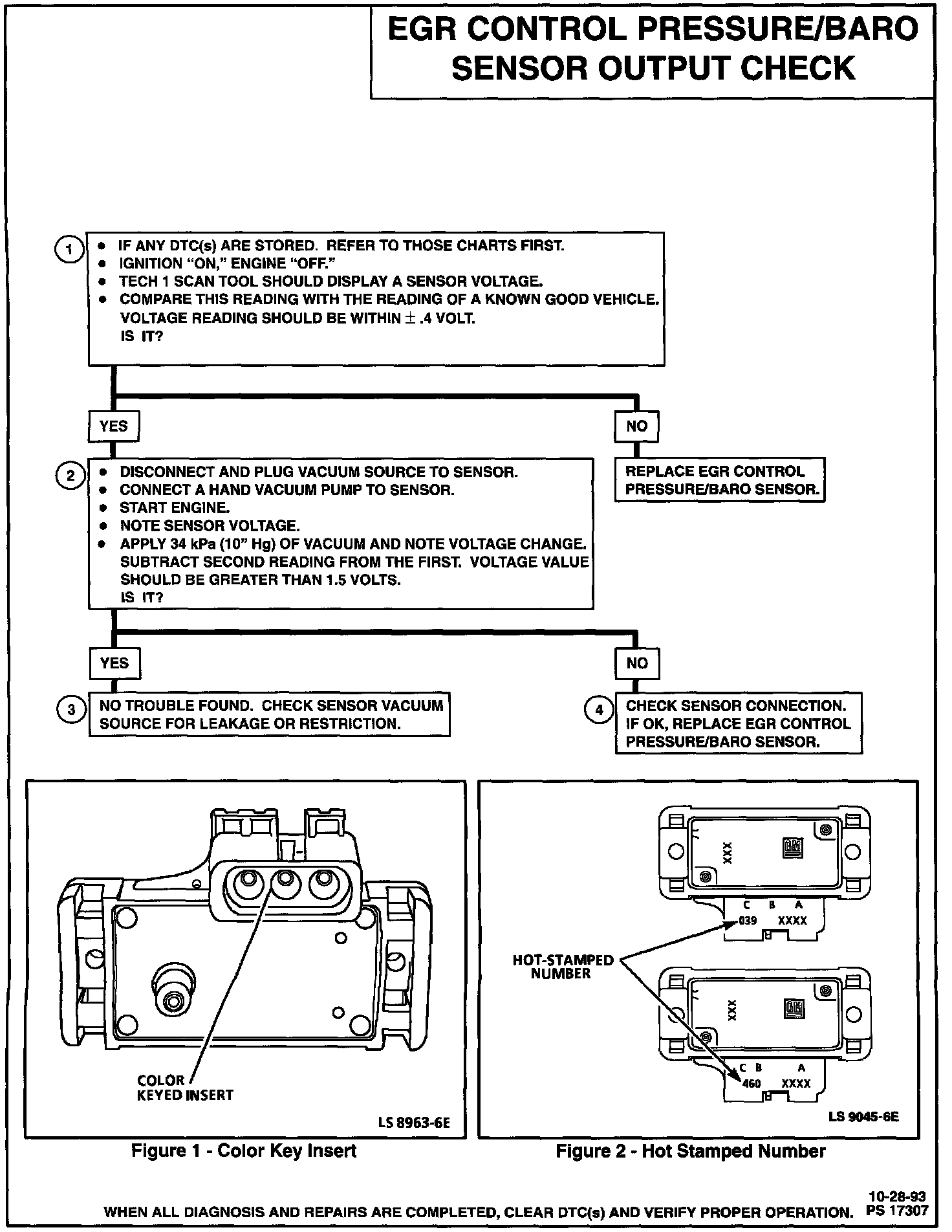 2. Applying 34 kPa (10" Hg) vacuum to the sensor should cause the voltage to change. Subtract second reading from the first. Voltage value should be greater than 1.5 volts. When applying vacuum to the sensor, the change in voltage should be instantaneous. A slow voltage change indicates a faulty sensor.