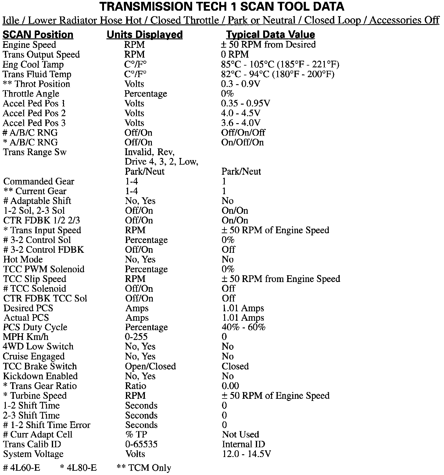 Only the parameters listed in the images are used for diagnosis. If a scan tool displays other parameters, the values are not recommended by General Motors for use in diagnosis. For more description on the values and use of the Tech 1 to diagnose Powertrain Control Module (PCM) inputs refer to Testing and Inspection of the component being tested. If all values are within the range illustrated, refer to Automatic Transmission/Transaxle / System Diagnosis. Testing and Inspection