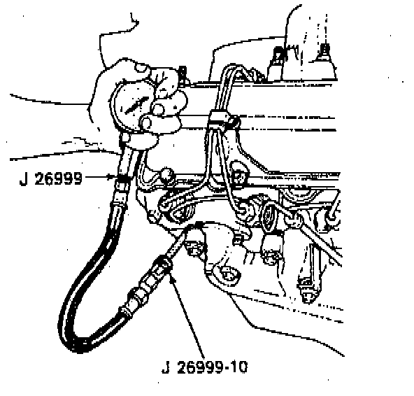 4. Screw the J 26999-10 into the glow plug hole of the cylinder that is being checked. Connect the J 26999-10 to the J 26999.
