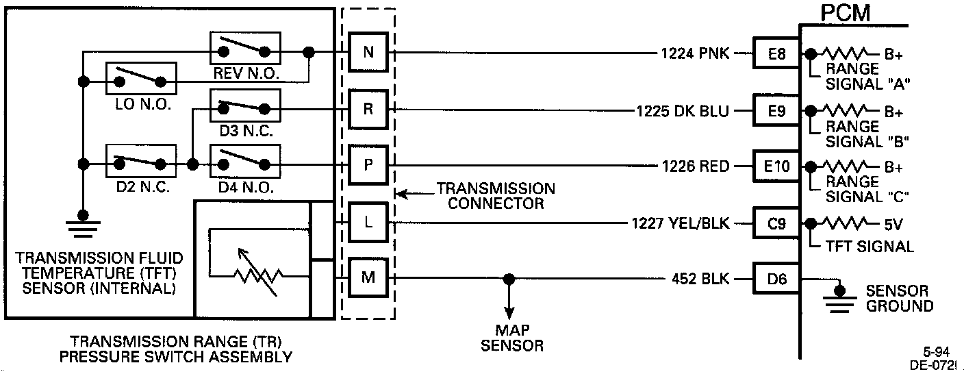 The Transmission Range (TR) switch assembly consists of five pressure switches (two normally closed and three normally open), and a Transmission Fluid Temperature (TFT) sensor combined into one unit and mounted on the valve body. The Powertrain Control Module (PCM) supplies battery voltage to each range signal. By grounding one or more of these circuits through various combinations of the pressure switches, the PCM detects what manual valve position has been selected by the vehicle operator. With ignition "ON" and engine "OFF" P/N will be indicated. When transmission electrical connector is disconnected, the ground potential for the three range signals to the PCM will be removed, and with ignition "ON," D2 will be indicated.