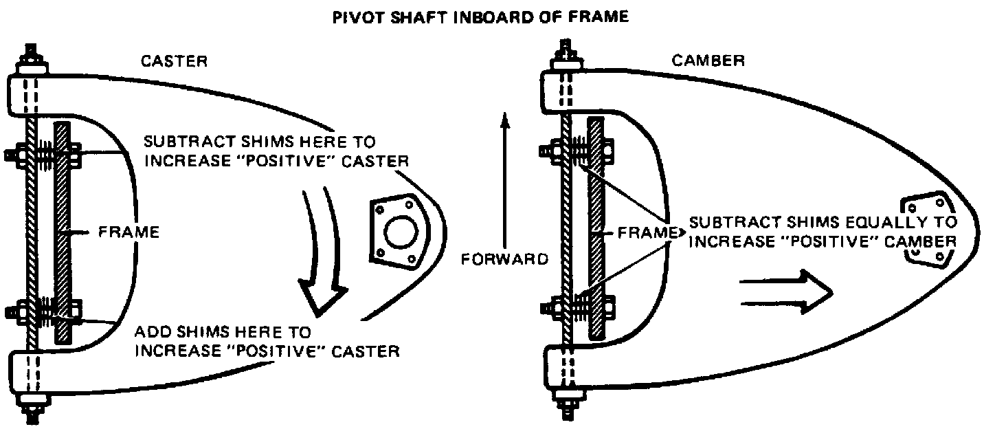 To adjust caster and/or camber, loosen upper control arm shaft-to-frame nuts, then add or subtract shims as necessary to adjust, then tighten nuts to specifications. After adjustment, the shim pack should have at least two threads of bolt exposed beyond the nut. The difference between front and rear shim packs must not exceed 0.40 inch.