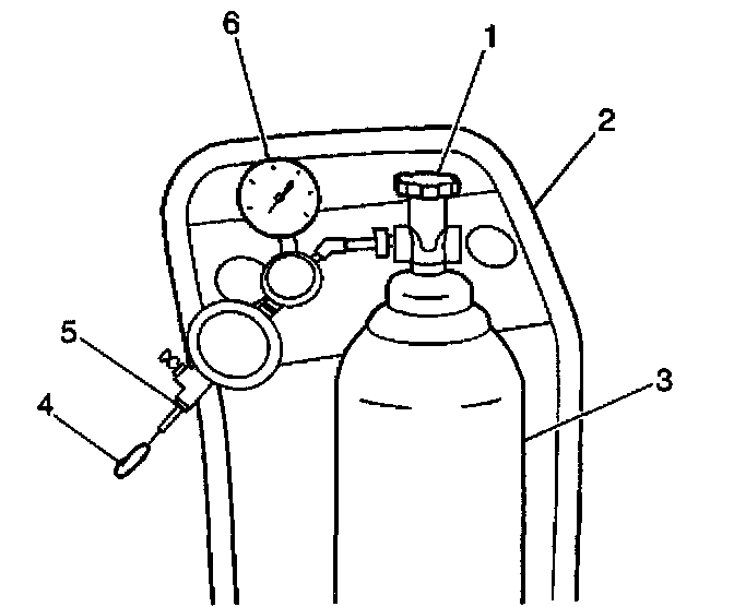 9. Disconnect the black hose (4) that connects the nitrogen cylinder to the cart J 41413 at the pressure regulator (5).