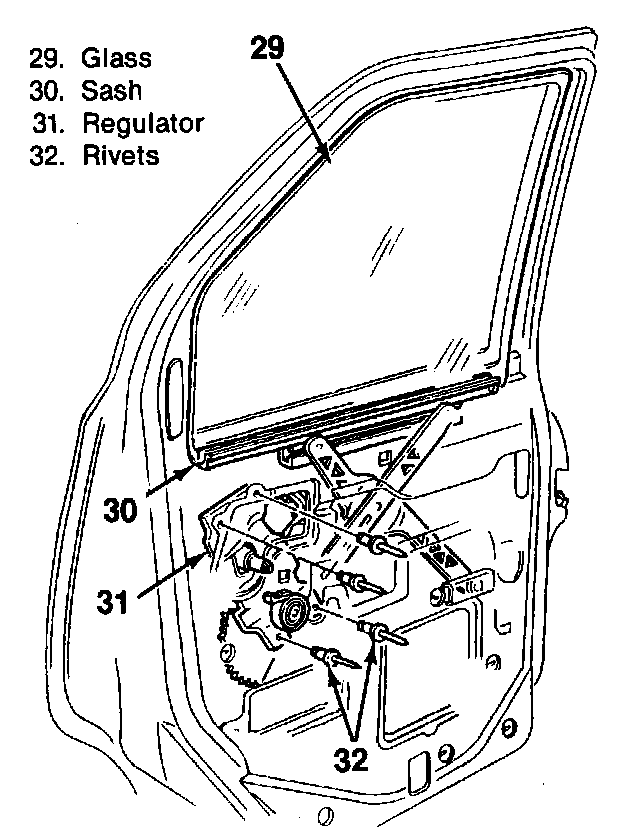 Note: Roll the window up, and apply cloth backed body tape from the window over the top of the door to the other side of the window to hold the glass in position when the regulator is removed.