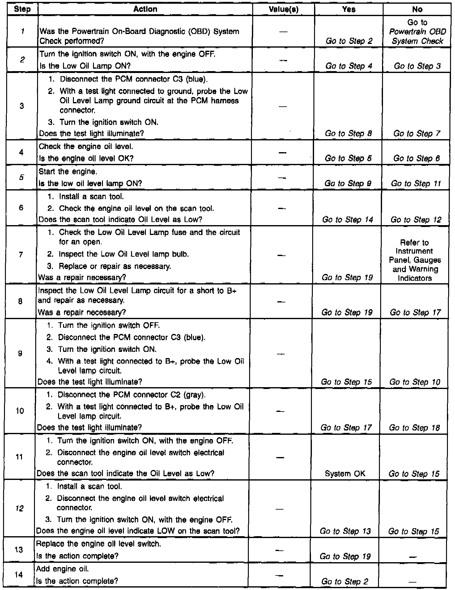 2. With the ignition switch turned ON and with the engine OFF, the PCM should ground CKT 1173 and illuminate the Low Oil Level Lamp.