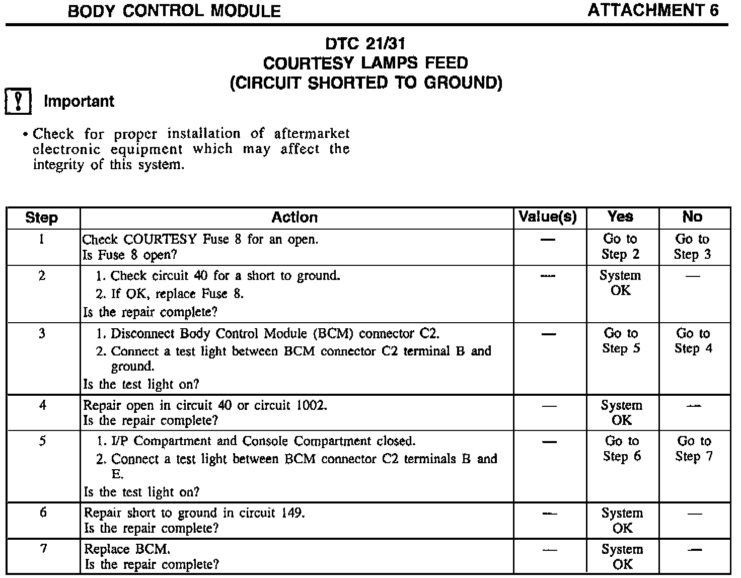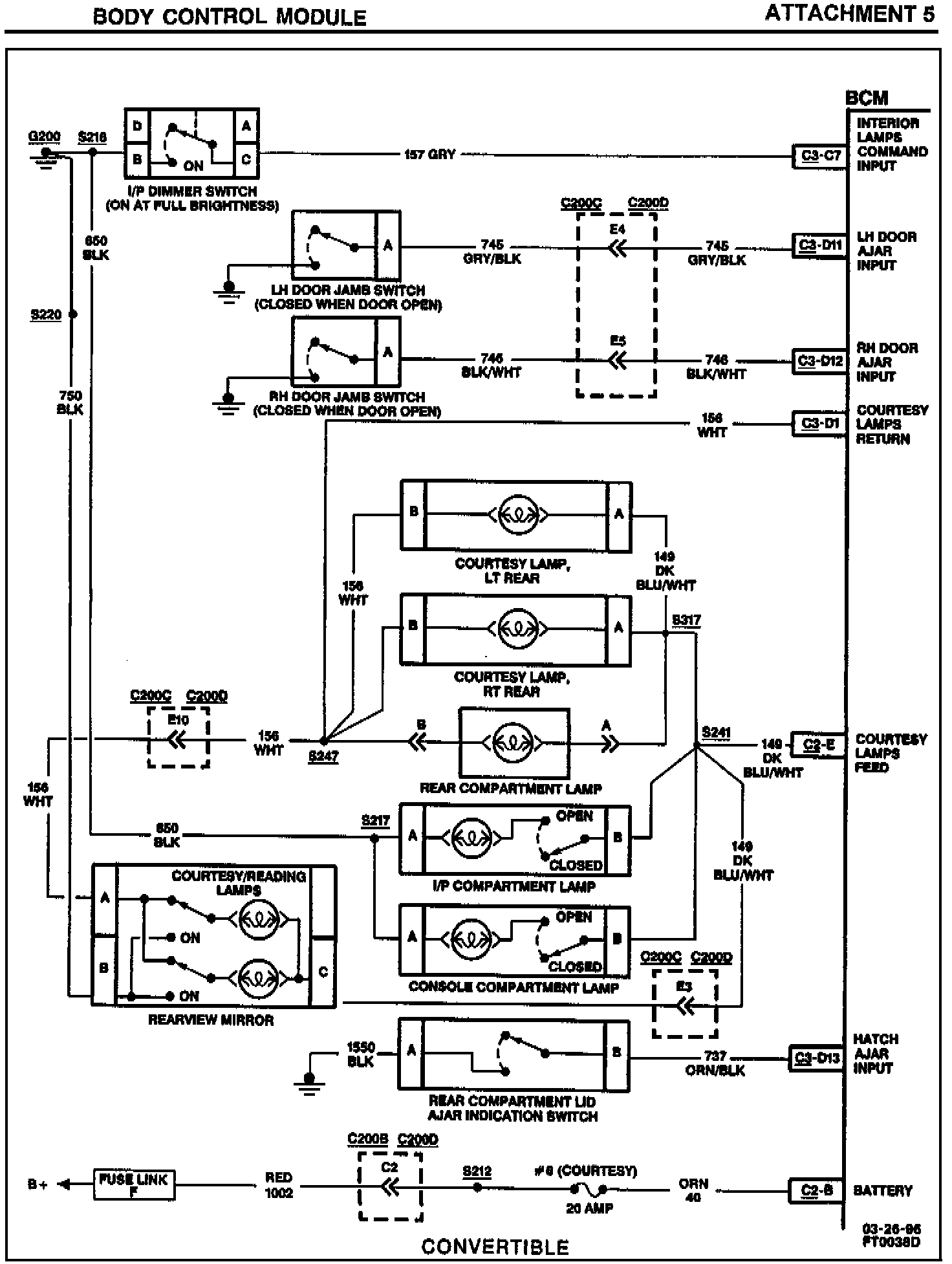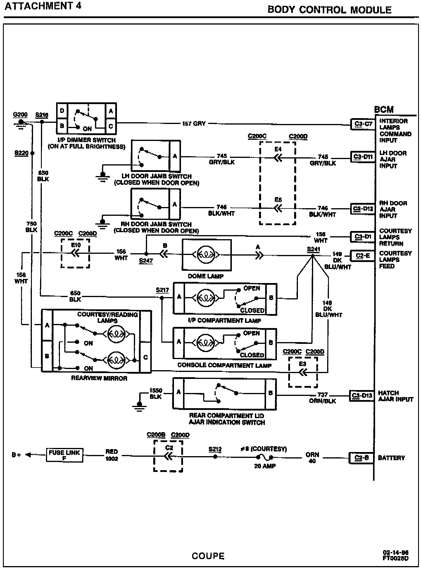 Circuit DescriptionThe BCM provides a 12 volt output to the courtesy lamps on circuit 149 to S241 when commanded by the I/P Dimmer Switch input, the RH or LH Door Jamb Switch inputs, or the Rear Compartment Lid Ajar Indicator Switch input. S241 distributes power to the following on the coupe and convertible models (see Attachments 4 and 5).