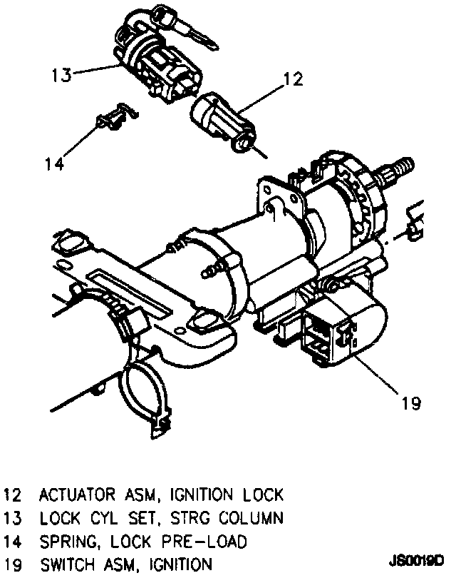 The mechanical key and lock cylinder is located in the steering column assembly on the right-hand side, just below the steering wheel. The Ignition Switch is located below the left-hand side of the steering column. The electrical switching portion of the assembly is separate from the key and lock cylinder. However, both are synchronized and work in conjunction through the action of the actuator rod assembly. The Ignition Switch pulls CKT 1350 low (to ground, 0 Volts) while the Ignition Switch is in "START." This is called the Cranklow Signal. The Cranklow input signal allows the IPC to start a timing window during which the Passlock (TM) Lock Cylinder must transmit the correct R-Code.