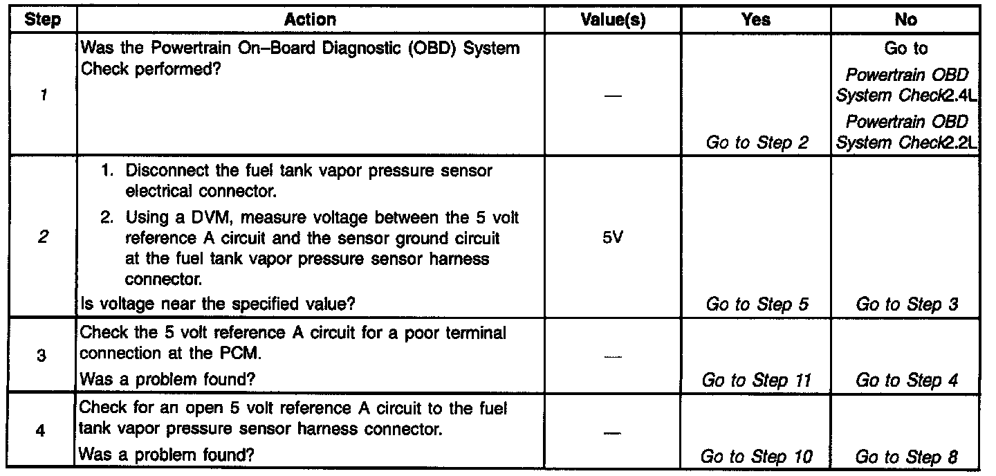5. A normal fuel tank vapor pressure sensor voltage output with no pressure or vacuum on the fuel system should be between 1.3 V and 1.7 V.
