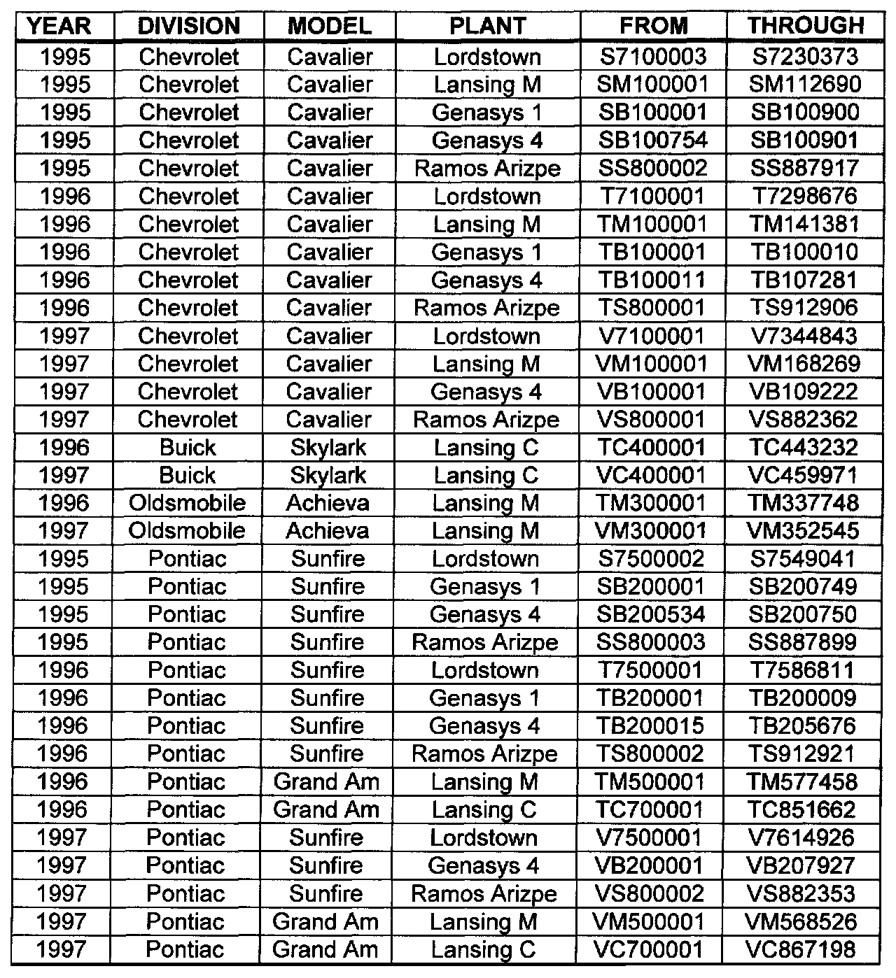 Involved are certain 1995-1997 Chevrolet Cavalier and Pontiac Sunfire model cars, and 1996-1997 Buick Skylark, Oldsmobile Achieva, and Pontiac Grand Am model cars built within the VIN breakpoints shown.