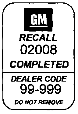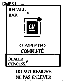 Put the Recall Identification Label on a clean and dry surface of the radiator core support in an area that will be visible to people servicing the RECALL vehicle. Additional Recall Identification Labels for Canadian dealers can be obtained from DGN by calling 1-800-668-5539 (Monday-Friday, 8:00 a.m. to 5:00 p.m. EST). Ask for Item Number GMP 91 when ordering.