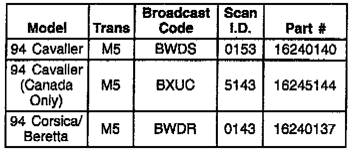 1994 Chevrolet Beretta, Cavalier, Corsica with 2.2L Engine (VIN 4 - RPO LN2) and Manual Transmission