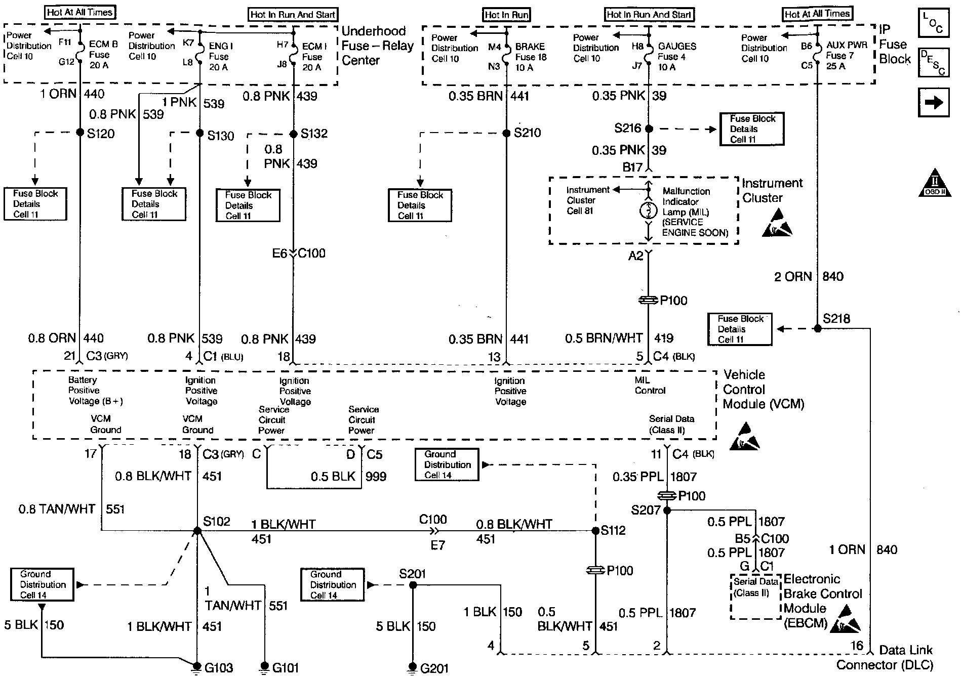 There should always be a steady Malfunction Indicator Lamp (MIL) when the ignition is ON and the engine is stopped. Battery voltage supplies the lamp. The VCM turns the lamp on by grounding the MIL control circuit whenever a DTC sets and the DTC meets the requirements for illuminating the MIL.
