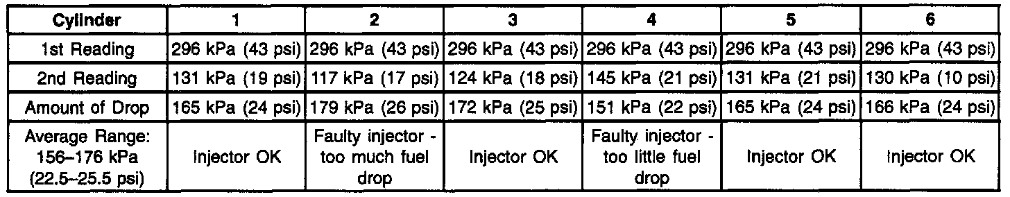7. If the pressure drop value for each fuel injector is within 10 kPa (1.5 psi) of the average pressure drop value, the fuel injectors are flowing properly. Calculate the pressure drop value for each fuel injector by subtracting the second pressure reading from the first pressure reading. Refer to the figure.
