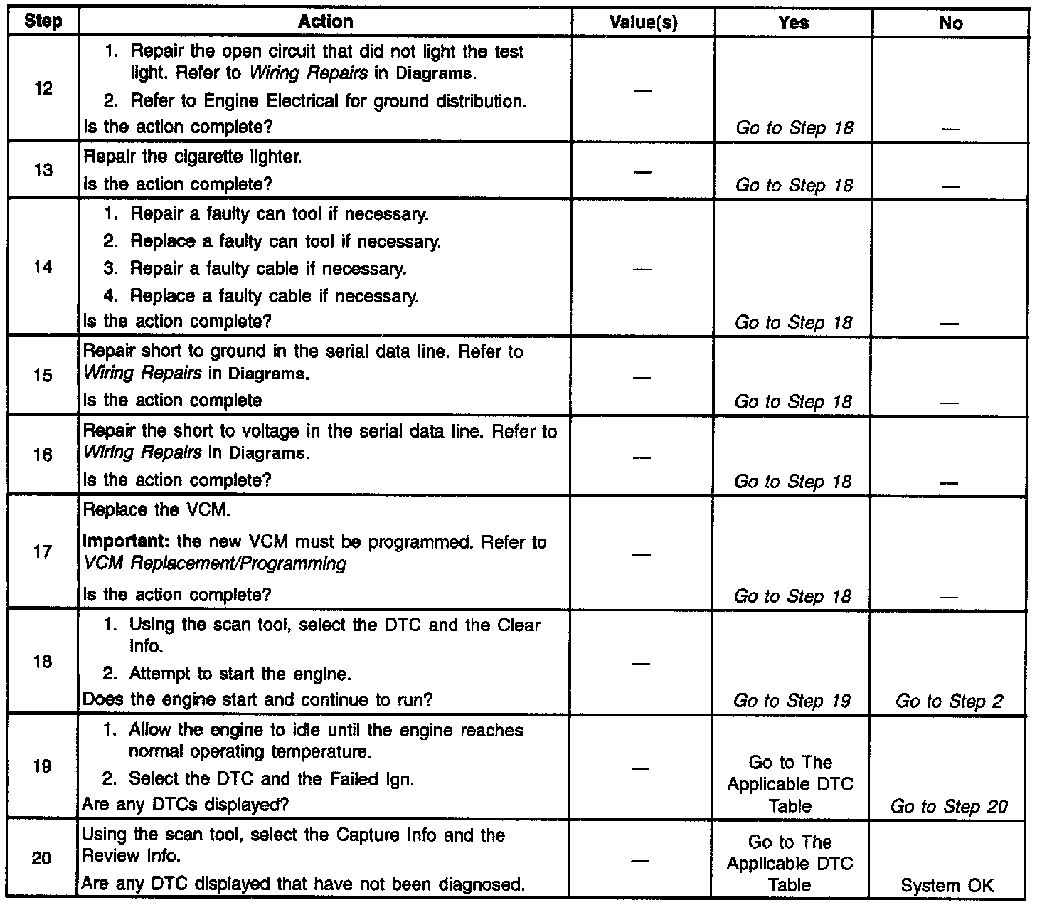The numbers below refer to the step numbers on the diagnostic table.