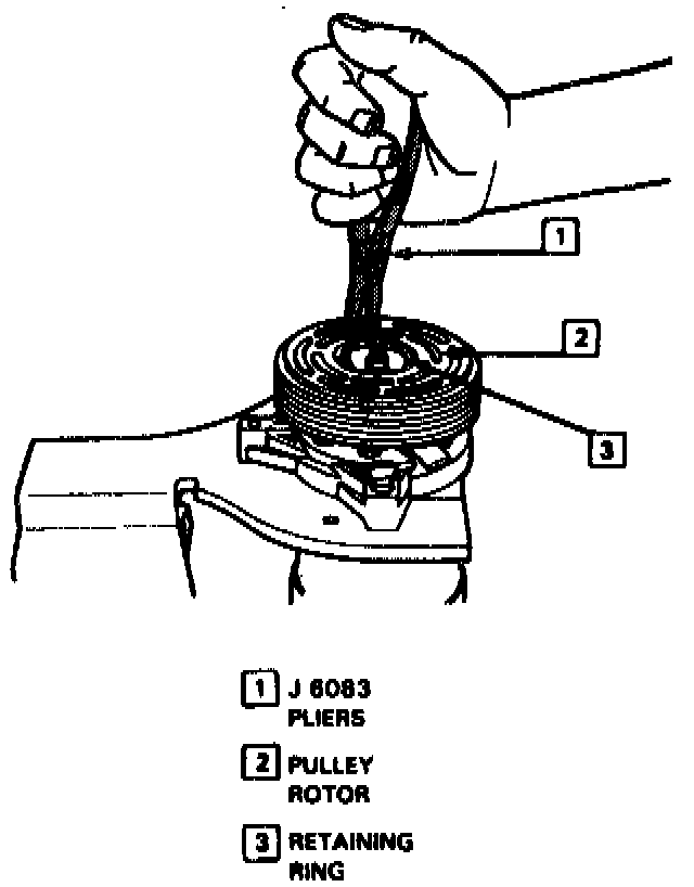 2. Remove rotor and bearing assembly retaining ring, using snap ring pliers J 6083.